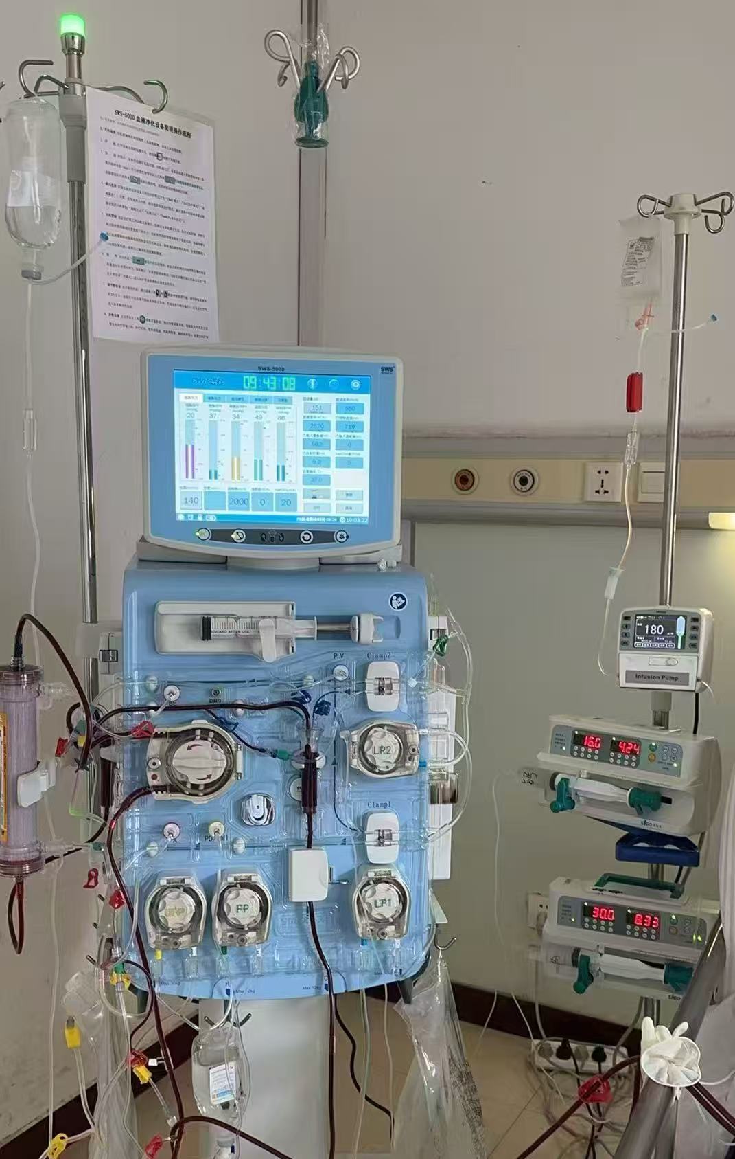 专科设备:现代化的医疗设备完善,拥有费森尤斯,贝尔克,东丽,日机装等多种透析机,血滤透析机,CRRT机。